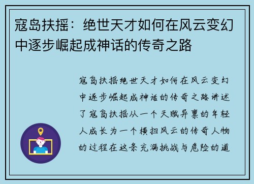 寇岛扶摇:绝世天才如何在风云变幻中逐步崛起成神话的传奇之路